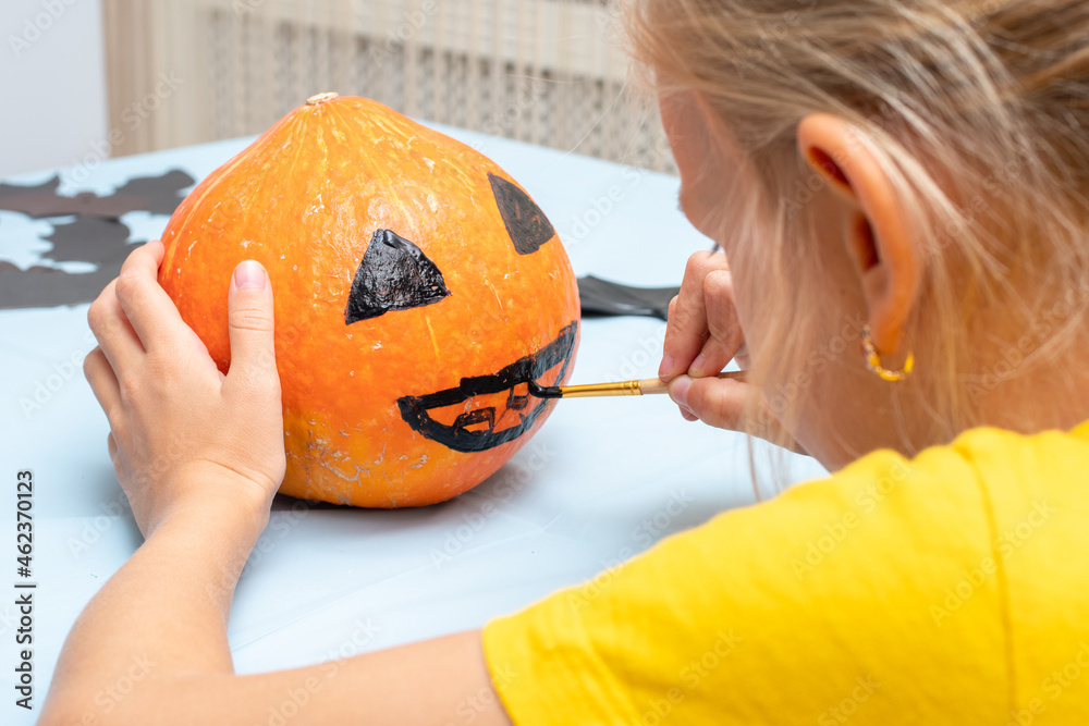 Cute Girl Painting Scary Face On Orange Pumpkin With Brush For Home Decoration During Halloween Holiday Stock Photo Adobe Stock